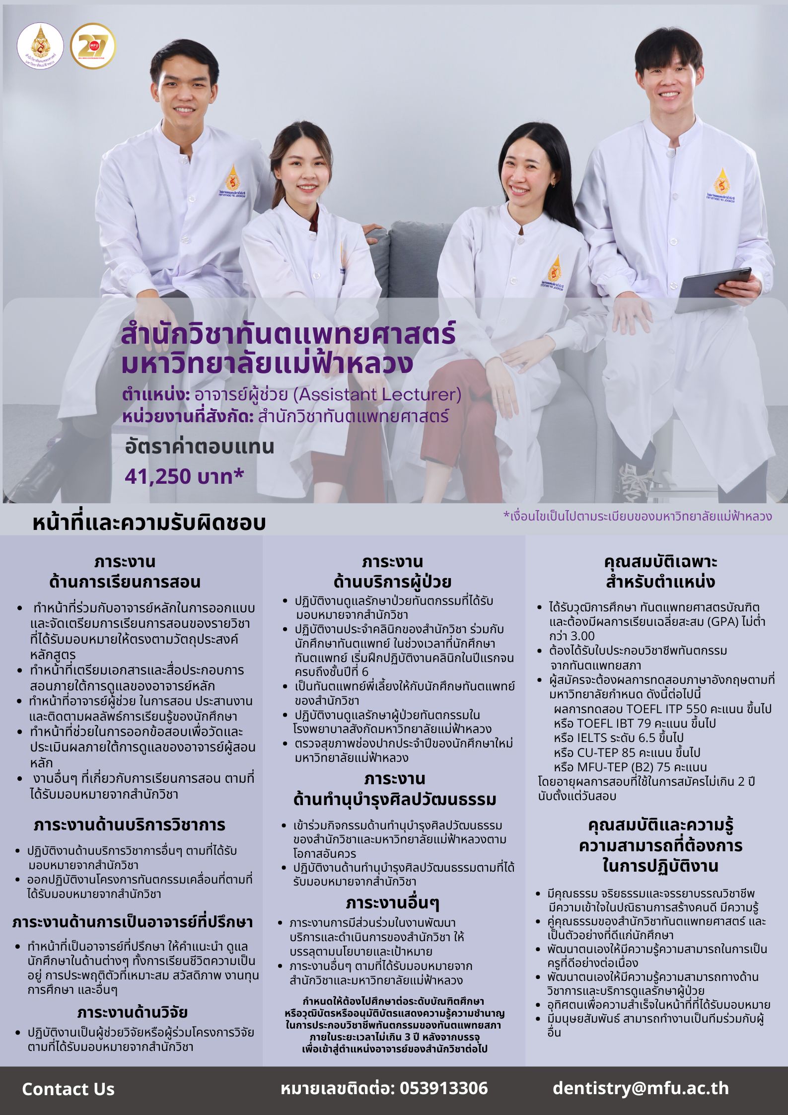 รับสมัคร ตำแหน่งอาจารย์ผู้ช่วย (Assistant Lecturer) สังกัดสำนักวิชาทันตแพทยศาสตร์